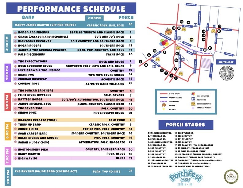 All PorchFest performances are FREE, with tips for the musicians suggested. The 2pm band is for people who purchased VIP tickets only. From 7-8 pm, four downtown venues will feature spotlight musicians. The event closes with a concert from 8-10 at the South end of Main Street. The full schedule of performance is available in our line-up.